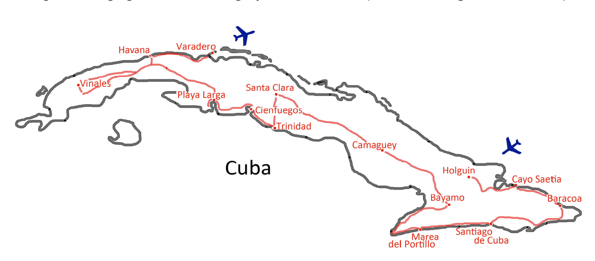 De reis begint in Holguin, aan de oostkant van Cuba. Langs de noordkust gaat de route richting het pittoreske Baracoa. Via de prachtige bergweg La Farola gaat het naar de zuidkant van het eiland. Hier is het veel droger en groeien zelfs cactussen. In het rustieke koloniale Santiago de Cuba zijn leuke kleine straatjes en typische Cubaanse barretjes. Na een bezoek aan het grote fort gaat het verder door het Sierra Maestra gebergte naar Bayamo, met een fraai gerenoveerd koloniaal centrum. De grote vierbaansweg door Cuba, aangelegd door tussen met grootheidswaanzin wordt, behalve een paar auto’s, vooral gebruikt door fietsers en paard en wagens. Via de prachtige stad Camaguey vind je in Santa Clara de laatste rustplaats van de iconische Che Guevara. Na een bezoek aan zijn mausoleum gaat de route verder richting een van de mooiste steden op Cuba: Trinidad. Deze stad is wel een vrije dag waard, om heerlijk door de kleine straatjes te dwalen. Via het strand van Playa Larga, ga je op weg naar de vallei van Viñales. Trek de wandelschoenen aan, om de vallei te voet te verkennen, tussen landbouwvelden en tabaksplantages door, omringt door steile bergwanden. Als laatste staat Havanna op het programma, de prachtige hoofdstad van Cuba, waar je heerlijk door vervallen en gerenoveerde koloniale straatjes kunt dwalen. Ook de Malecon, de boulevard langs de kust, is bezienswaardig. De terugvlucht gaat vanaf het nabij gelegen Varadero. Het is ook mogelijk om de reis te verlengen met een paar dagen aan het strand van Varadero.