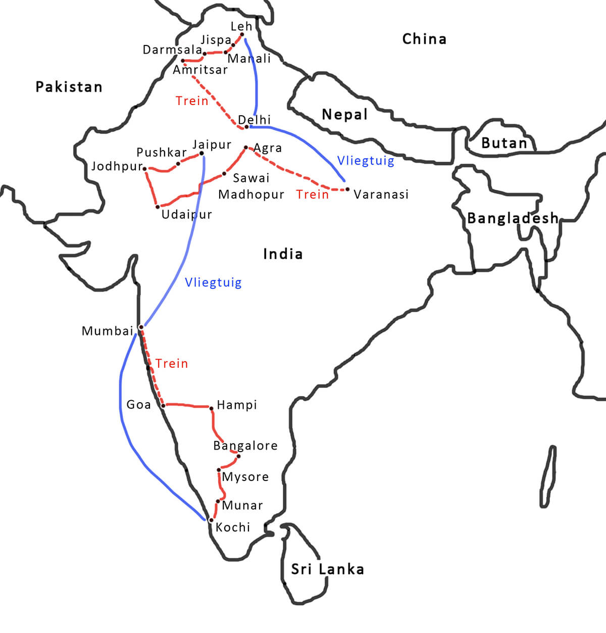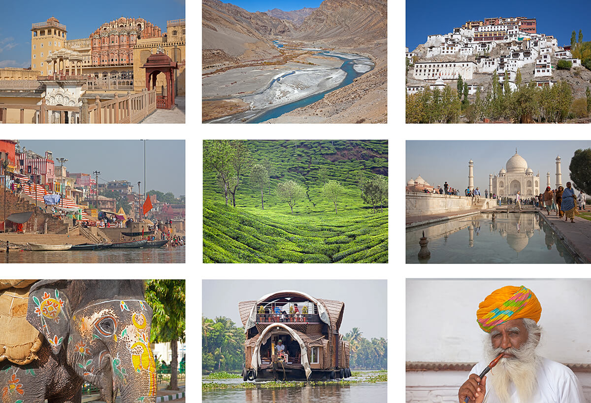 Van een cultuurschok is meestal wel sprake wanneer je in de hoofdstad van India land. Delhi, het is een indrukwekkend doolhof van klein straatjes vol winkeltjes en toeterend verkeer. Na een bezoek aan deze wereldstad, gaat het met de trein naar Amritsar, op zoek naar de gouden tempel van de Sikh. Op weg naar de Himalaya is er een overnachting in Darmsala, de plek waar de Dalai Lama in ballingschap leeft. Over grote hoogtes gaat het richting het pittoreske bergdorp Leh, zowel in Leh als de omgeving vind je prachtige Tibetaanse kloosters. Vanaf Leh vlieg je via Delhi naar Varanasi om aan het tweede deel van de reis te beginnen. Varanasi ligt aan de heilige Ganges rivier jaarlijks komen vele Indiërs hier naartoe om te baden in de rivier. Na een nachtje met de trein ben je in Agra, waar de beroemde Taj Mahal wacht, het grote witte marmeren gebouw werd door Shah Jahan bebouwd als graftombe voor zijn vrouw. In het Nationale Park Ranthambore gaan we op zoek naar de Indiase tijger. Van hieruit ga je verder naar Udaipur, de prachtige stad die door de James Bond film Octopussy op de kaart gezet werd. Het gaat verder door de deelstaat Rajastan, naar de blauwe stad Jodhpur. De Braham, de hoogste Indiase kaste kleurt zijn huis graag blauw. Via het pelgrimsoord Pushkar ga je verder naar Jaipur, de roze stad met het prachtige Amber kasteel. Vanuit Jaipur vlieg je naar het zuiden van India om de deelstaat Kerala te bezoeken, waar alles over het water gaat. Vanuit een boot, zie je hoe de kinderen per boot naar school gaan, de rivieren zijn hier letterlijk de waterwegen. Via de prachtige theeplantages van Munar gaat het richting Bangalore, de tech-stad van India. In het pittoreske dorpje Hampi heeft de tijd stilgestaan. De tempelcomplexen aan de Tungabhadra rivier staan op de werelderfgoedlijst. Vanuit Hampi gaat via de badplaats Goa naar Mumbay. Vanuit deze mondaine wereldstad vlieg je terug naar huis.
