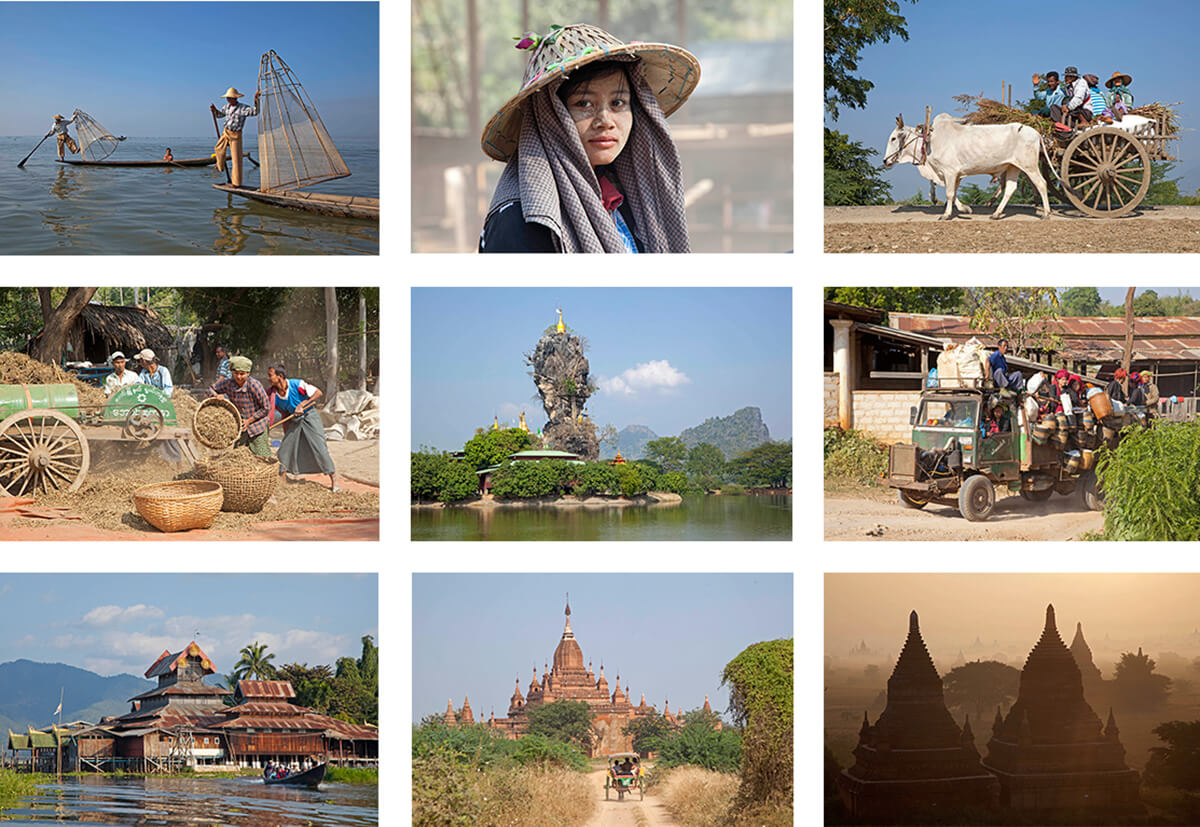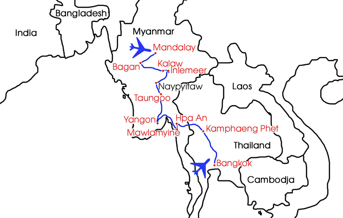In Myanmar, het voormalige Birma, heeft de tijd lang stilgestaan. Op het platteland is de ossenkar het belangrijkste vervoermiddel. De reis begint in Mandalay, deze stad kun je gemakkelijk bezichtigen op een fietstour, die ook het platteland rond de stad meeneemt. En er is tijd voor een boottocht naar de Mingun Pagode. Vanaf Mandeley ben je op tijd in Bagan om te picknicken tussen de eeuwenoude tempels. Na een bezoek aan verschillende prachtige bouwwerken, kun je genieten van een zondondergang over een tempelzee van ruim 2000 Boeddhistische bouwwerken. Onderweg naar Kalaw is het mogelijk om te helpen een olifantje te wassen in olifantenopvangcentrum. Vanaf het pittoreske station van Kalaw gaat het verder met de trein richting het Inlemeer. Langs het ondiepe Inlemeer staan de woningen op palen en alle vervoer is per boot. Vanaf het Inle meer vlieg je naar Yangon, in deze oude hoofdstad bepalen koloniale gebouwen de sfeer. Bij deze oude vervallen gebouwen steekt de pracht en praal van de Shwedagon pagoda enorm af. De reis gaat verder over land naar Mawlamyne, de stad van de Mon. Het is een mooie tocht over de rivier van Mawlamyine naar Hpa An door een gebied met prachtige groene karstbergen. In de omgeving van Hpa An is bekend om de grotten vol met Boeddhabeelden, die door pelgrims bezocht worden. We steken de grens over naar Thailand en de reis eindigt in Bangkok, met een mogelijke verlenging aan het strand van Hua Hin, op een paar uur met de trein van Bangkok.